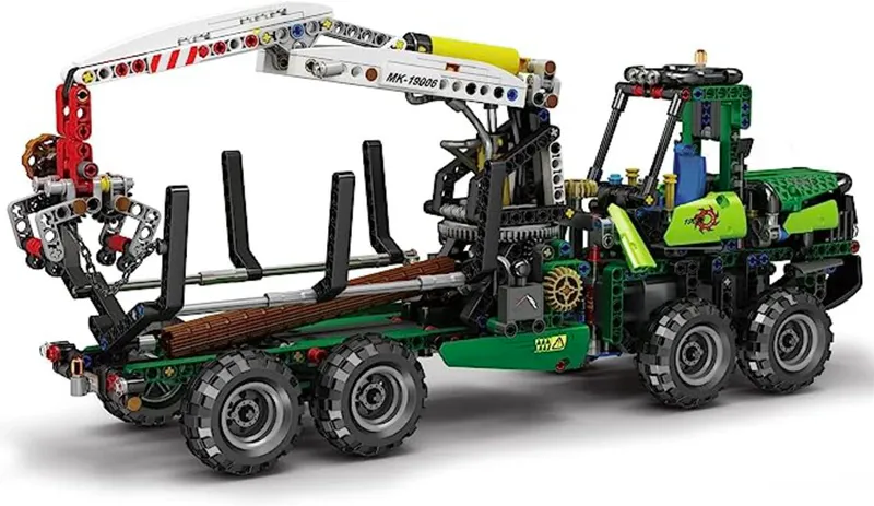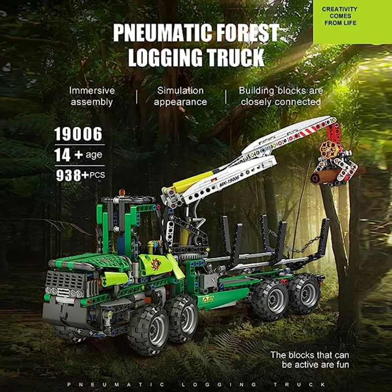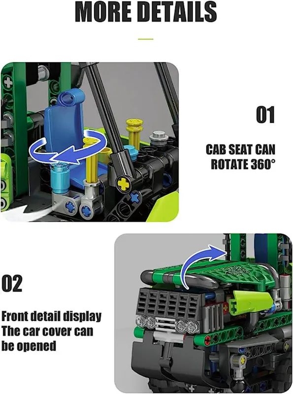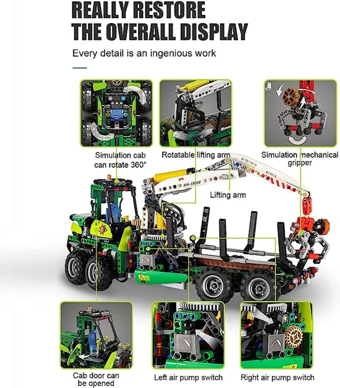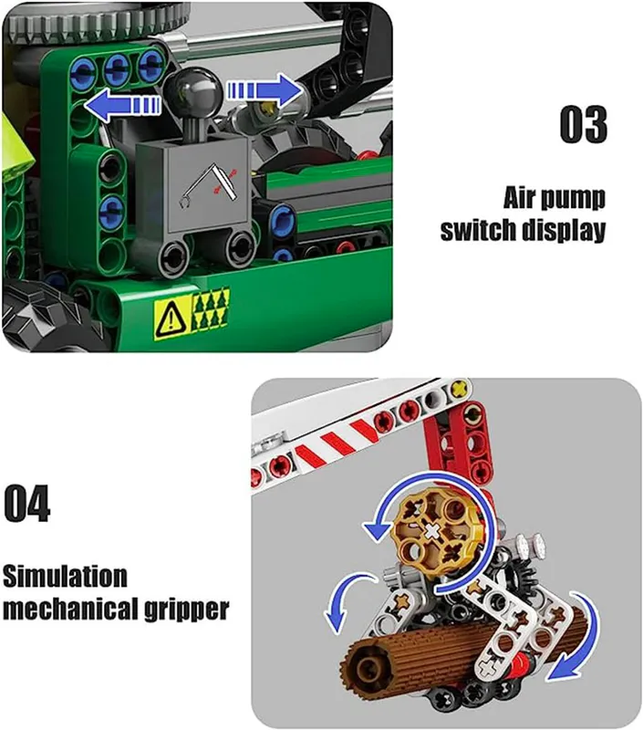 Comes with pneumatic accessories, this forest machine building toy will automatically operate the lifting arm and the gripper to grab after power on. You can adjust the knob on the gripper to change gripping angle. 360 degree rotation cab, rotatable lifting arm and there are more fun waiting you to discover |